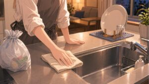ここで大切なのは、完璧に磨き上げることではなく、翌朝すぐ使える状態へ戻すことです。たとえば、洗い終わった食器を全部棚へしまえなくても、シンクに何も残っていない、調味料が所定の場所へ戻っている、その二点だけでも十分です。小さな基準でも毎日続くと、散らかり方が大きく変わってきます。